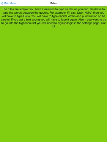 Can you type your texts fast? If you have proclaimed yourself the best texter among your texting friends and family, this is your time to rise to the top of the list and shine like a texting pro! The game is fun and the rules are simple! You have two minutes to type the quoted words, the text has to be correct! Capitals and punctuation always count! If you sign up for the leaderboard option, you can even compete in the global texting arena! Download today and wage text wars, with your mad texting skills, against others!