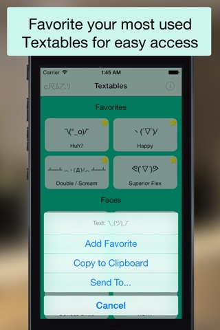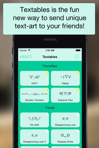 Textables is the fun new way to send Unicode and ASCII text art to your friends! Explore a library of over 100 ASCII & Unicode artwork that you can easily send to your friends over SMS, iMessage, Email, Facebook, and Twitter!