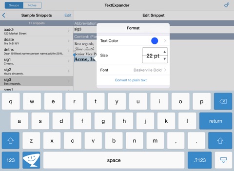 Well, it was promised that this app would support snippets entered from a separate BT keyboard. Regular TextExpander wasnt doing it, so I bought this app in order to have this feature, so I could use my new BT keyboard and type faster. It does not do it. At least with my keyboard. I will be contacting Apple to get my money back.