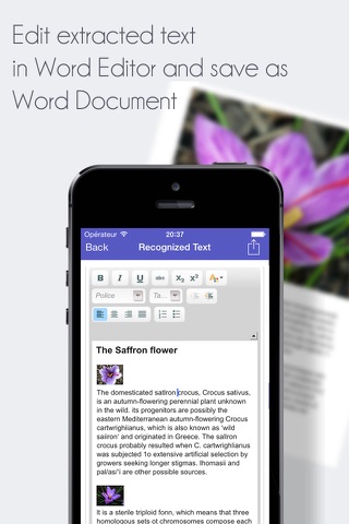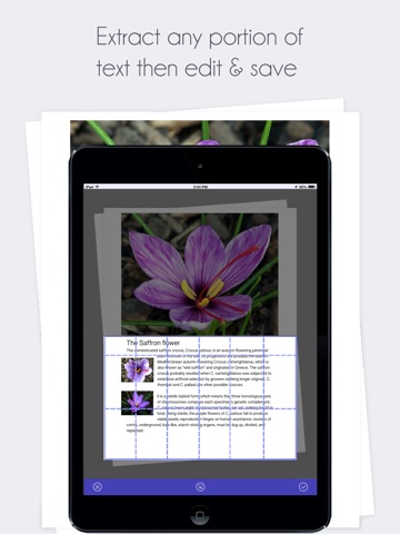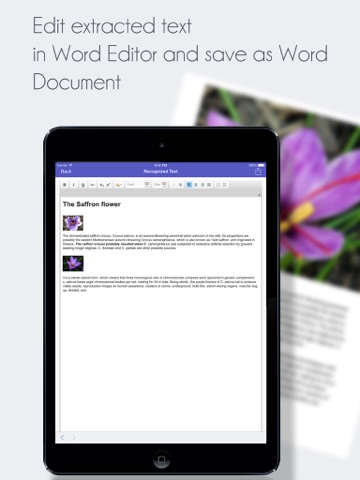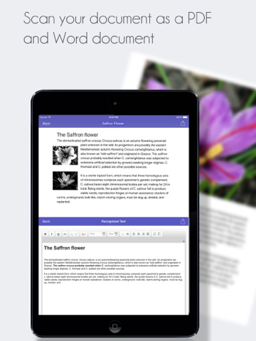 Text Extractor instantly extracts text from a picture you take with your device or one already in your Image Library with split screen: top screen is PDF result and bottom screen is the Word Processor with the extracted text.