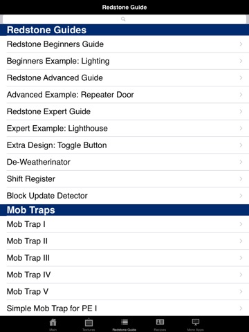 Textures & Redstone for Minecraft includes a massive collection and guide for textures AND a full Redstone Guide, from beginner to expert knowledge and designs. Also included are all the recipes in the game in a simple search utility.