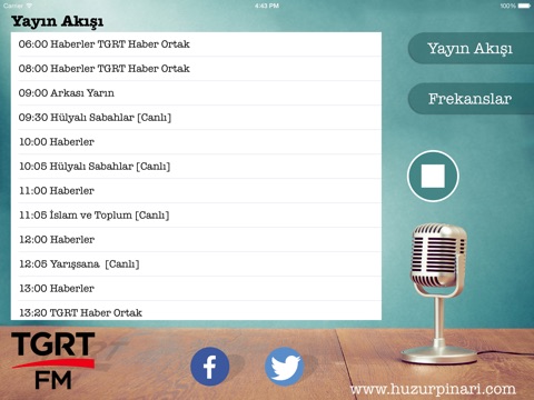 Bu uygulama TGRT FM radyosunu internet uzerinden daha rahat dinleyebilmeniz icin Tüplü Televizyon tarafindan hazirlanmistir. Ayrıca son 10 güne web arşiv kayıtları mevcuttur.