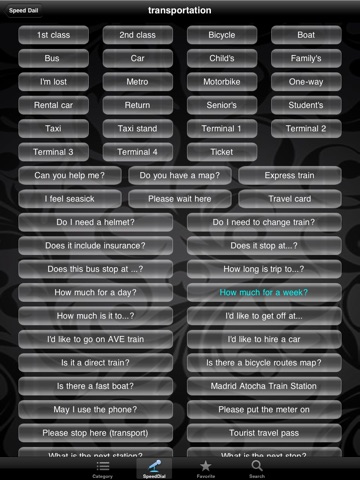 + Organized in 17 categories,Greetings,General conversation,Directions,Transportation,Eating out,Shopping etc