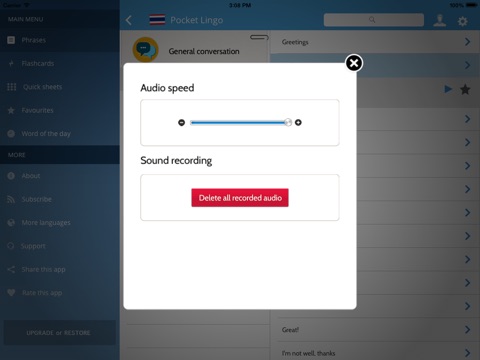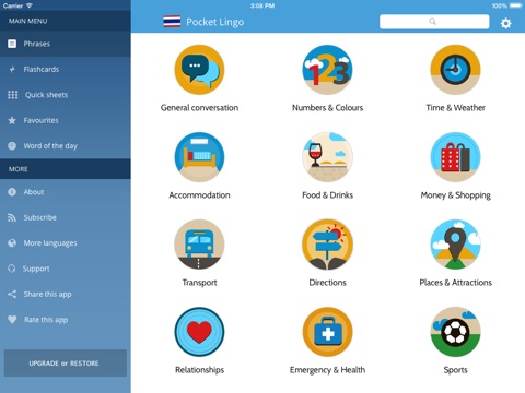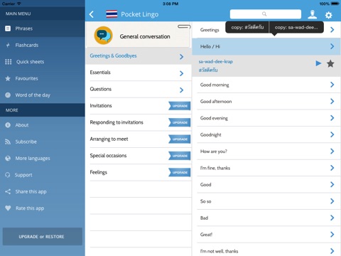 Best of all its free to download and try. If you like it upgrade to the full version with more content and additional features such as quick sheets for different situations and flashcards to help you perfect your Thai pronunciation.