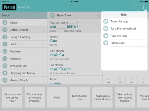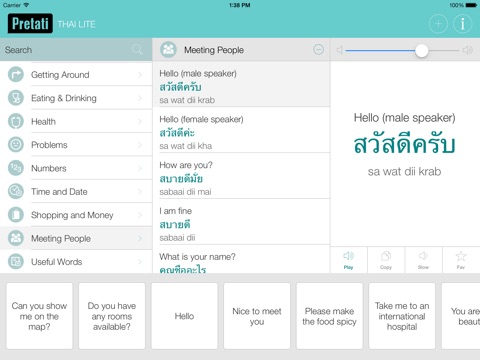 The Thai Pretati app is great for foreign travelers and those wanting to learn how to speak the Thai language. The app has over 500 commonly used phrases grouped in 10 different categories including Basics, Getting Around, Eating & Drinking, Health, Problems, Numbers, Time and Date, Shopping & Money, Meeting People and other Useful Words.