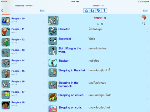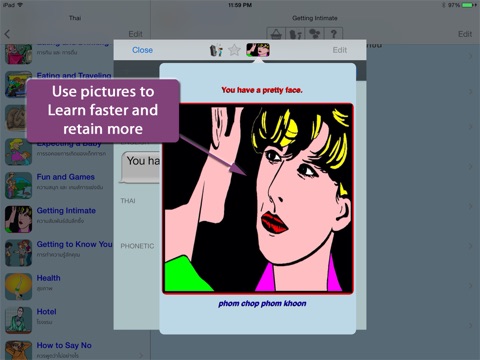 I have bought every Apps for Thai learning I found on the Appstore so I have 53 Apps to learn Thai, I am not mad LOL simply very motivated ! So I thought some Apps must be good some less good ... Other real trash! So it was, some are even not working at all, others not talking! This one is a must, one of the 2/3 very very best one! I am learning Thai 4 hours every days... And I love it.You will find thousands of sentences, many times funny ones, sometimes completely mad. Only be patient for youll have to download the audio files for each sentence of course only once. With so many sentences/words many fields are covered.
