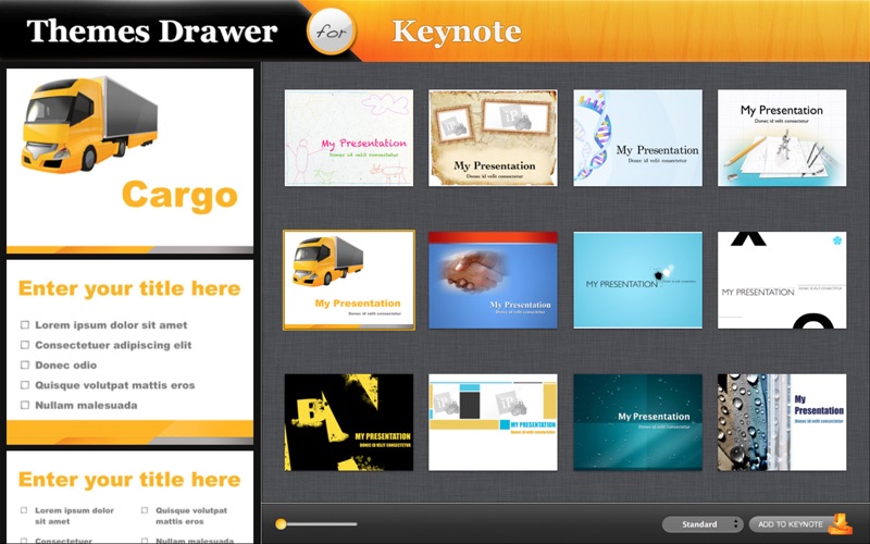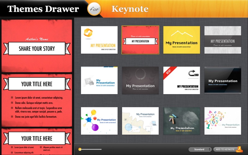 Share your great ideas effectively. Themes Drawer for Keynote includes a huge clean, straightforward or full of color themes collection to choose from. The variety of themes gives you a vast of freedom to turn the presentations into unforgettable show. Choose theme from a variety of presentation styles with coordinated fonts, colors, background textures, unique bullets and picture frames.