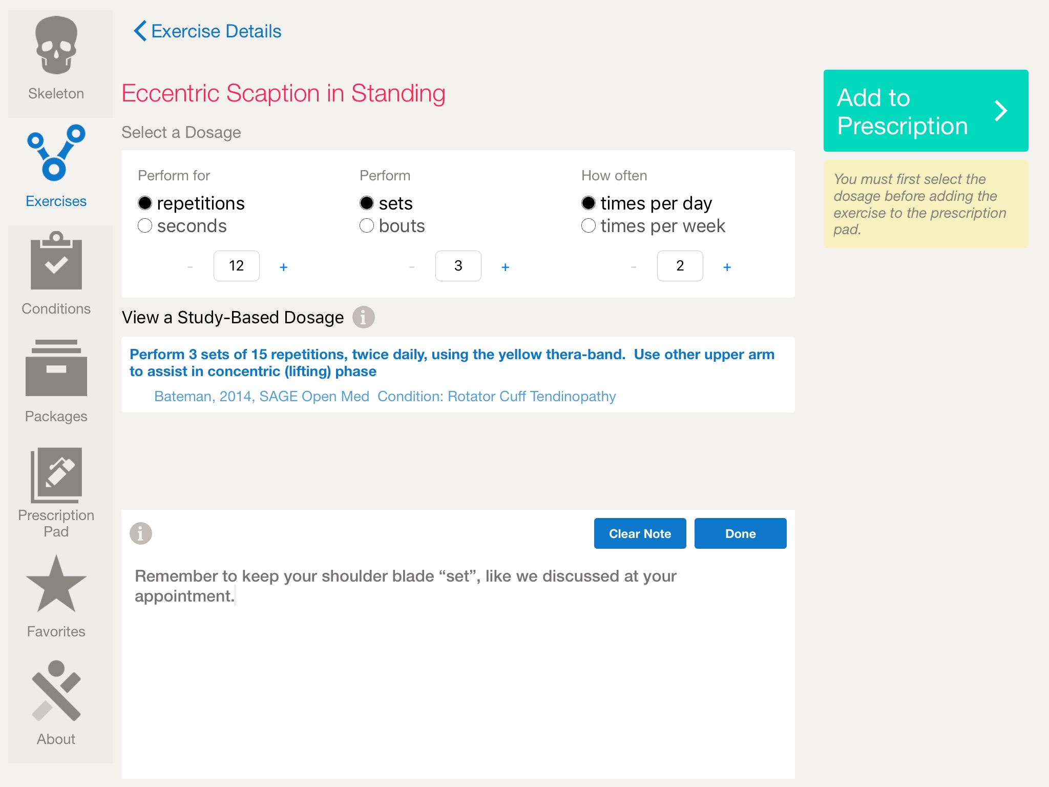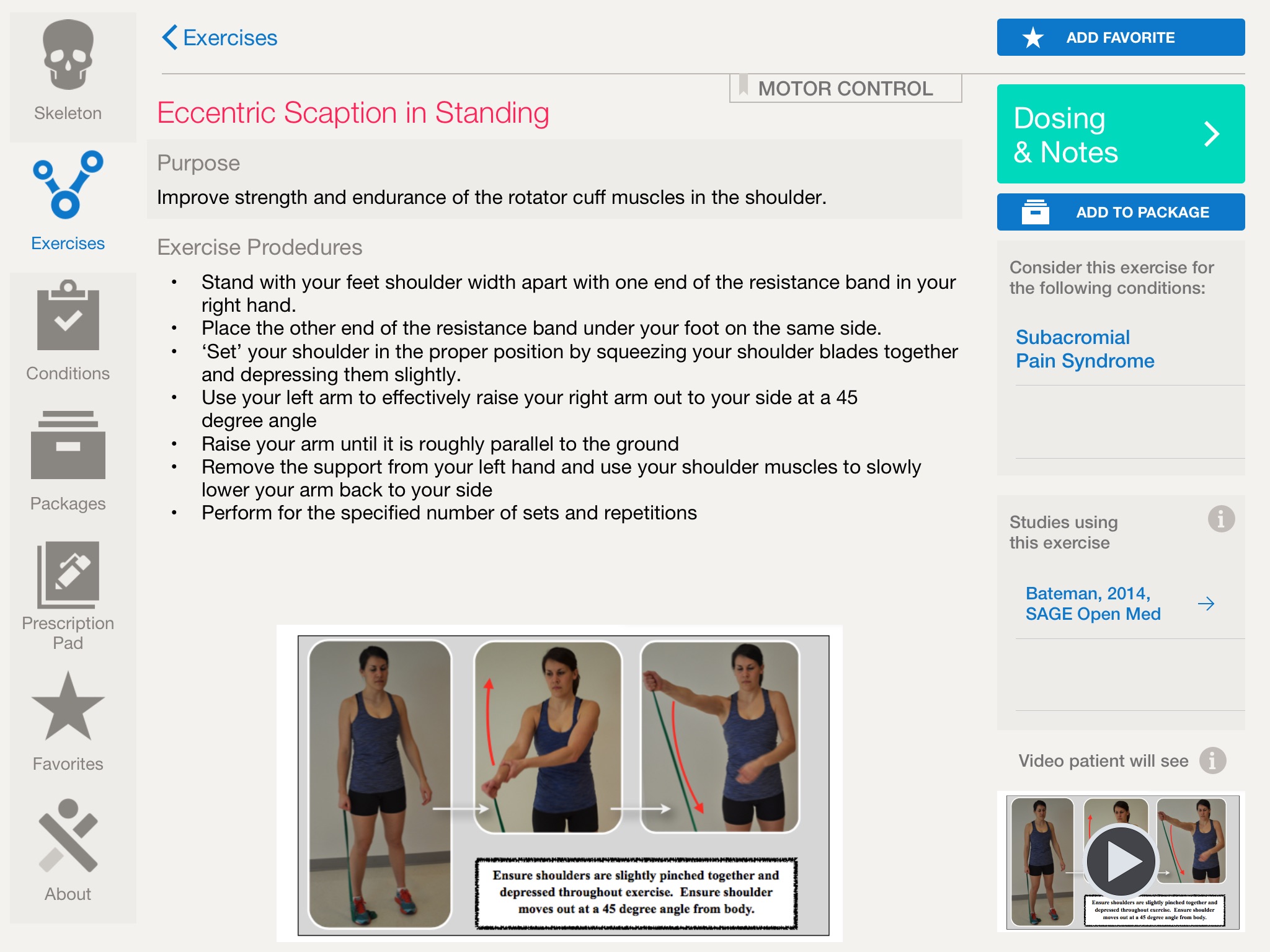 The app also serves as a powerful reference tool for clinicians. Evidence summaries covering the current state of published research related to the role of exercise for each common musculoskeletal disorder. Recommendations for patient education and research-based exercise dosing are also included.