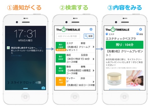 このアプリは、身近な「マッサージ」「エステ」「指圧」「整体」などの今だけお得なタイムセールをお知らせします。