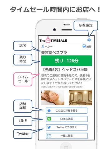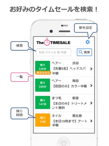 このアプリは、身近な「ヘアサロン(美容院・散髪屋)」「ネイルサロン」「まつ毛サロン」の今だけお得なタイムセールをお知らせします。