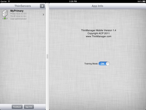 A Thin Client configuration utility for use with ACPs ThinManager software. This app brings the functionality of the original ThinManager software to your iPhone, iPad, and iPod Touch. This app allows you to shadow terminals, edit configurations, restart terminals, reboot terminals, edit display clients, view real time status information, and much more.