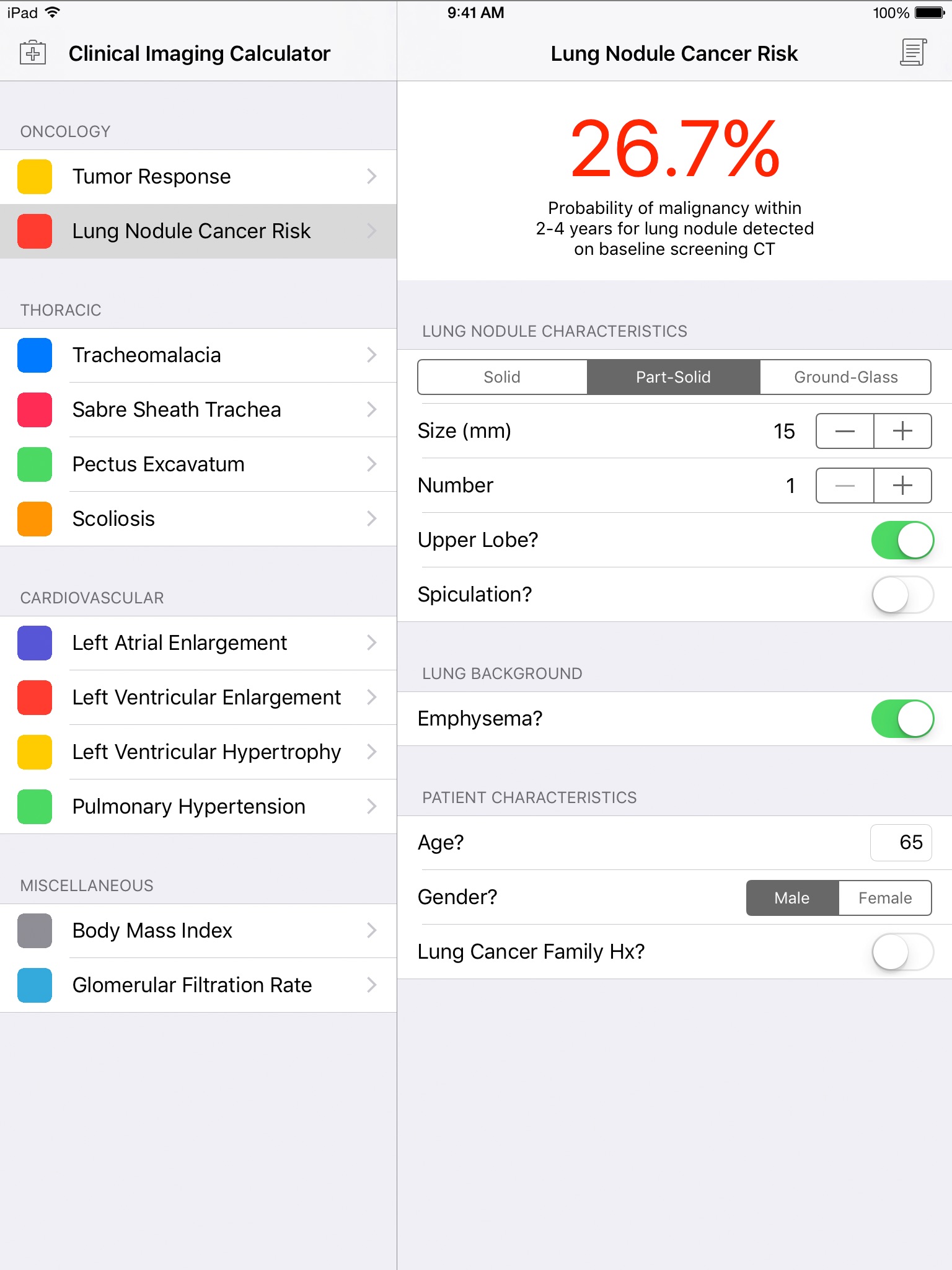 A collection of clinical calculation modules for values commonly encountered in thoracic imaging: