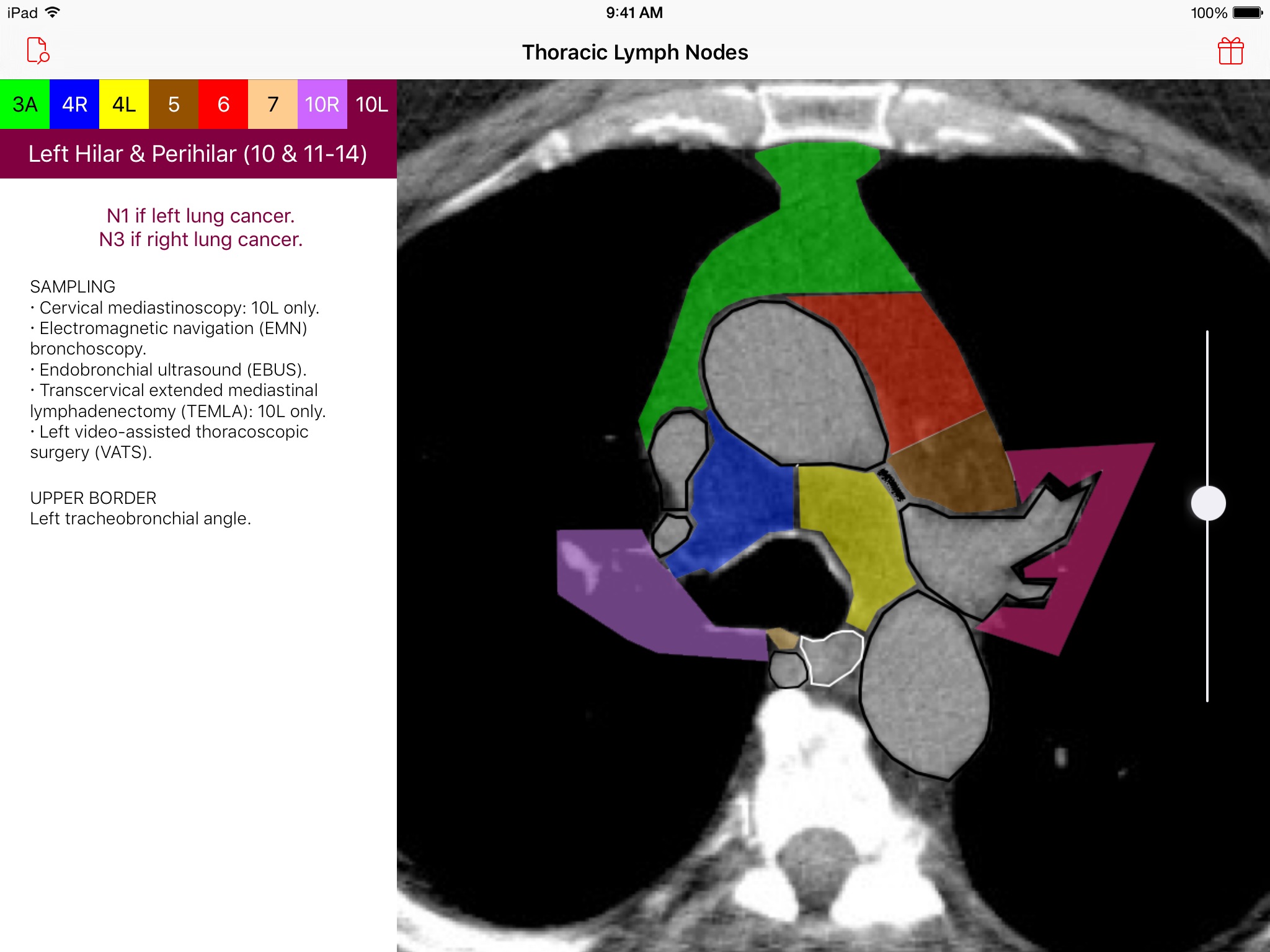 Effortlessly navigate through CT images of the chest and view beautifully illustrated, color-coded thoracic CT lymph node map anatomic definitions for each lymph node station. Delve deeper and learn more about classification, sampling options, and anatomic details of each lymph node station.