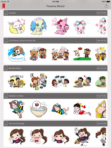 ThreemaSticker has tons of Emoji/Emoticon/Sticker/Chat Icon Image for you to choose: Cony, Cony & Brown, Jelly, Coffee, City Hunter, Doraemon, Looney, Marukochan, LINE bubble, LINE POP, Iron Man, Pokemon, Zombie, Hello Kitty, Manga characters, etc,. and sticker packages are updated regularly.
