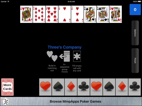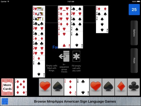 Three two-deck solitaire games with group moves enabled and a sparse starting tableau. All games are free-to-play, no in-app purchases.