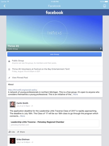 Our Thrive 45 Facebook page is active and a good place to keep in touch with the group. 45 degrees is the latitude halfway between the equator and North Pole - its also the informal southern border of northern Michigan.