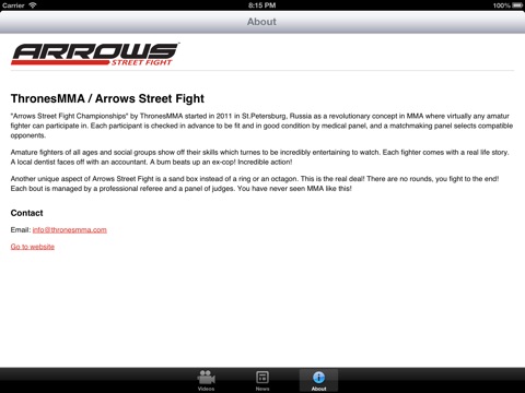 The best and exclusive video episodes of "Arrows Street Fight" Championships at your finger tips! Incredible never before seen bouts and adrenalin-pumping action! Real stuff, real street fighters in sand. Plus latest news about "ThronesMMA" and "Arrows Street Fight" Championships. Get it for iPhone or iPad!