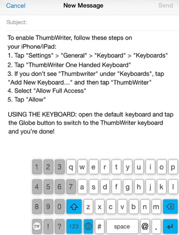 ThumbWriter is a One Handed Keyboard that lets you type quickly and efficiently using your thumb on just one hand! Reach all the letters on the keyboard using larger devices, including the iPhone 6, iPhone 6 Plus, and your iPad!