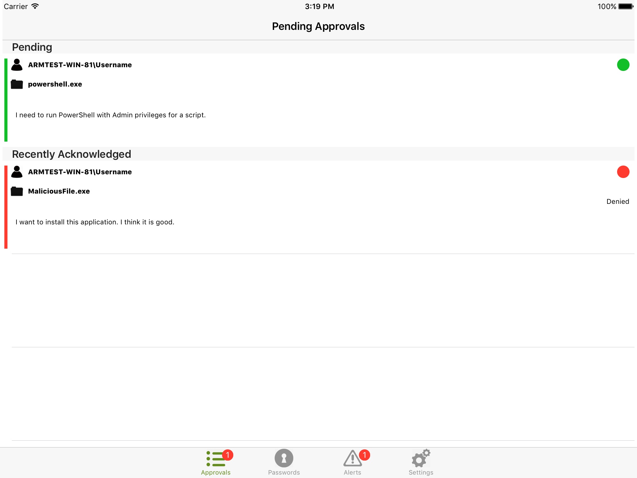 The Thycotic ACS app provides the ability to approve and deny application requests, disclose managed user passwords, and view pending alerts received from the Thycotic Management Server. This app requires that the Thycotic Management Server is configured to in order to receive Thycotic mobile app requests. Please see https://thycoticwiki.atlassian.net/wiki/ for more information.
