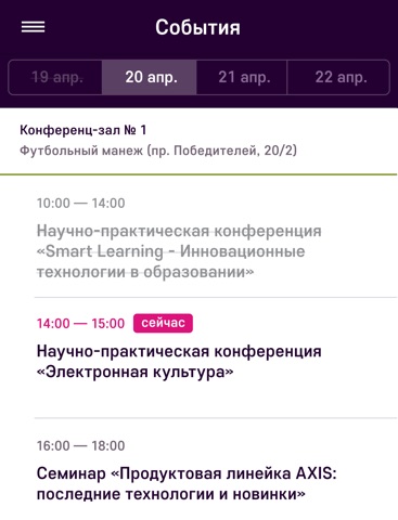 Интересные события: Расписание конференций, семинаров и мастер-классов. Кроме того, вы всегда будете в курсе, какое мероприятие проходит именно сейчас.
