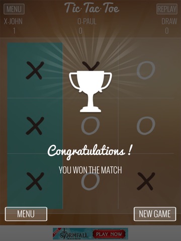 The player who succeeds in placing three respective marks in a horizontal, vertical, or diagonal row wins the game.