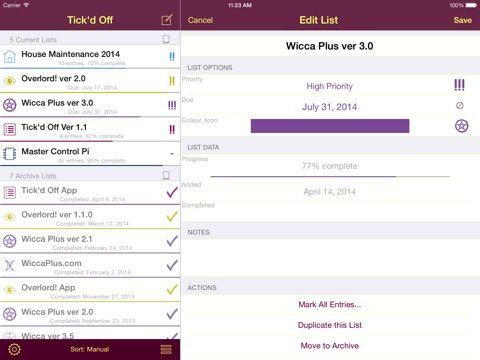 From a list of groceries to pick up on the way home from the office, to a project overview list of several dozen items spanning many months, Tick’d Off can help you organize and maintain what you need to do, and when you need to do it.