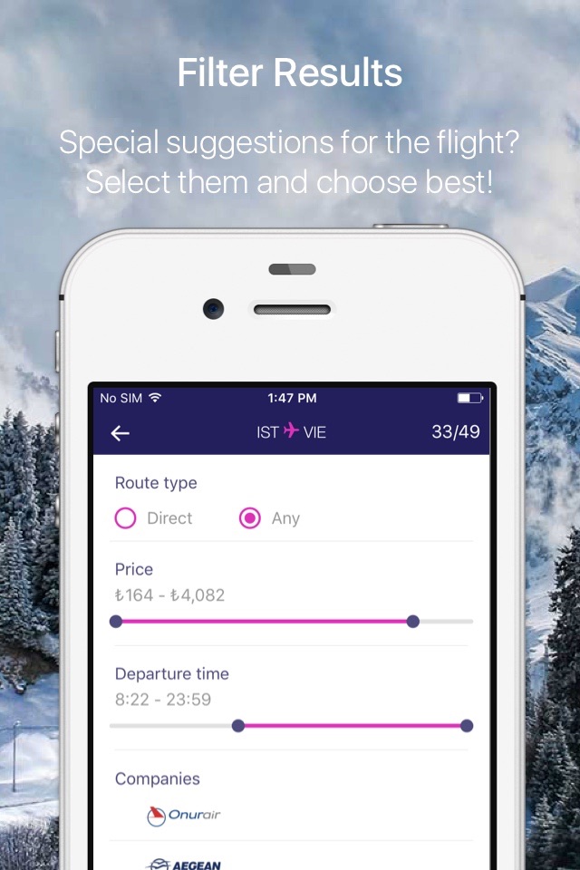 Tickets.com.tr application searches for air tickets from various airlines in different booking systems. As a result, you get the best offers from 900 airline companies: