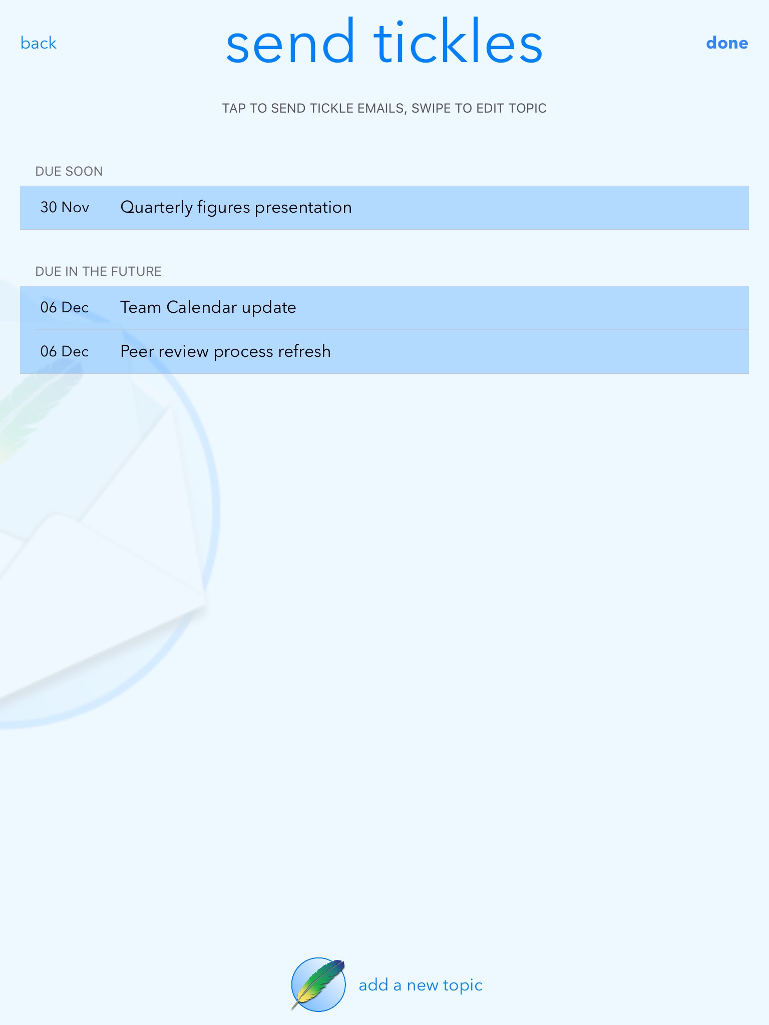 Tickle List is free to use for up to 5 tasks. An inexpensive in-app purchase allows unlimited tasks, and more options for how often to chase your team, and for when you get notifications - including every 1,2,3,4 Working Days, Quarterly, Bi-Annually etc.