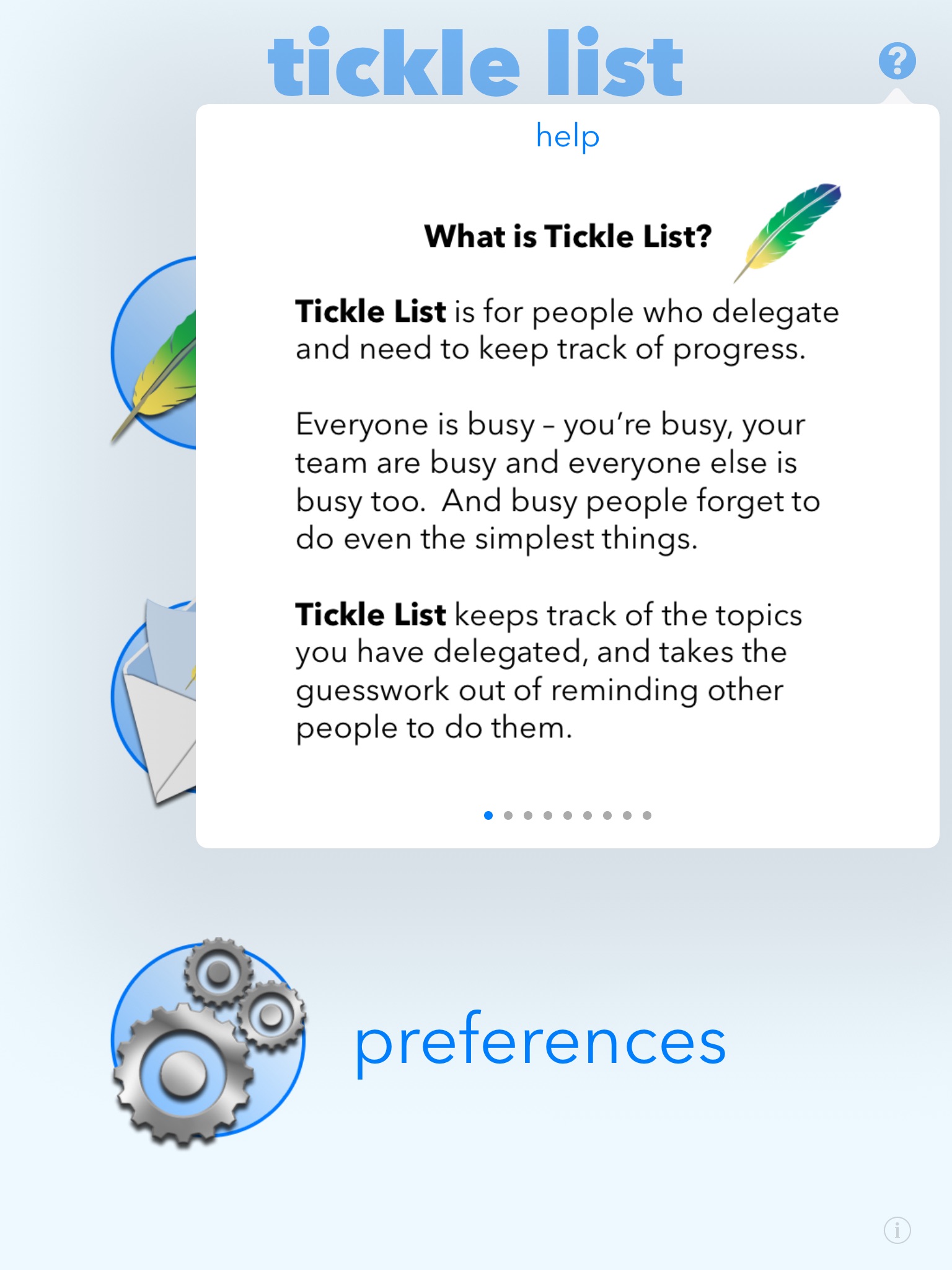 Tickle List is for people who delegate and need to stay on top of progress: its like a to-do list for the things other people are doing for you. Tickle List keeps track of all the tasks you have delegated and takes the guesswork out of reminding other people to do them. It helps you manage a busy team and keep them focused on the things that matter to you!