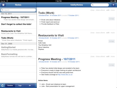 tiddlyNotes is based on TiddlyWiki (tiddlywiki.org), a personal web notebook. As there are so many note taking apps in the app store, why consider tiddlyNotes? Well, there are a number of good reasons: