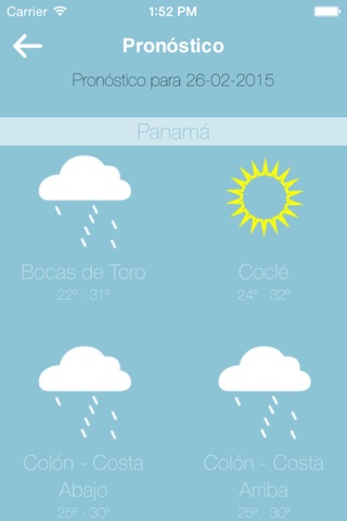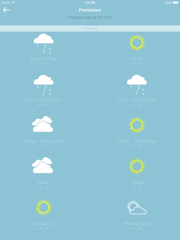 Con esta aplicación podrás conocer el tiempo detallado, tanto para hoy como para el resto de la semana en todas las provincias de Panamá: Bocas de Toro, Chiriquí, Coclé, Colón, Darién, Herrera, Los Santos, Panamá, Veraguas, así como de las comarcas indígenas de Emberá-Wounaan, Guna Yala y Ngäbe-Buglé.