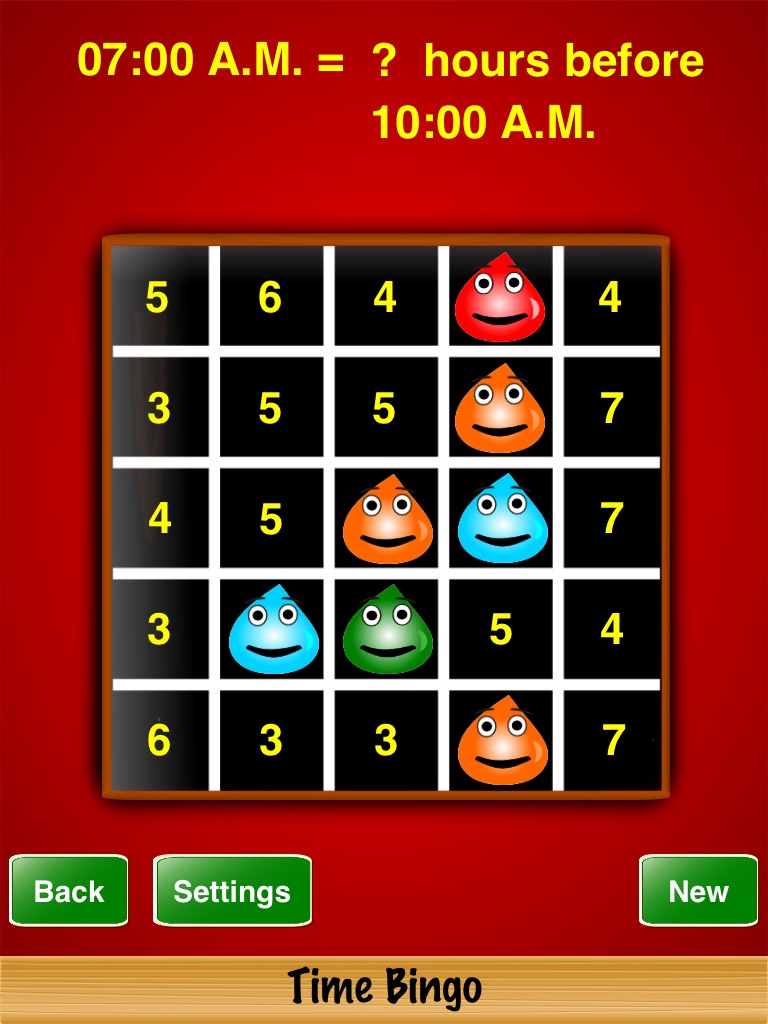 Time Bingo is a great time math game for the whole family. Select the test mode, difficulty level, and background in the "Settings" screen. Progress through the test modes and difficulty levels until you master the game. If you enjoy using the app, please dont forget to rate the app and write a review. Thank you for your support!