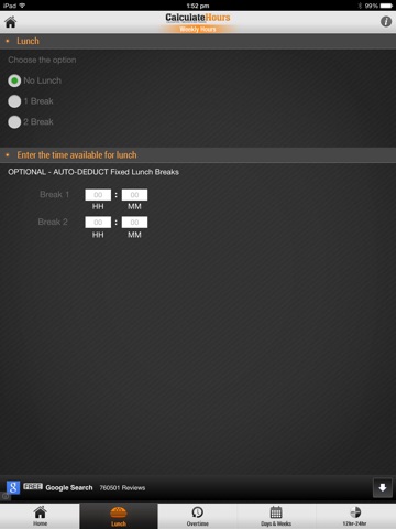 Or, if you do not log in and out for lunch each day, but you have a certain amount of minutes automatically deducted as lunch, you may enter 15 minutes, 30 minutes, etc. in the LUNCH tab, and this amount will be automatically deducted daily.
