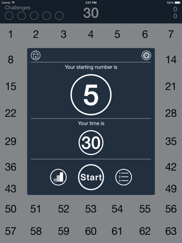 You have up to 63 numbers randomly placed on the screen depending on the device that you are using. Between each session the number placements are scrambled. When you get 5 double digit scores you move up to a higher level BRAIN challenge.