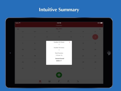 * Monthly Calendar shows summary view of your earnings for a day when tapped. Clock-in in a single tap for already added clients, by tapping on the plus button.