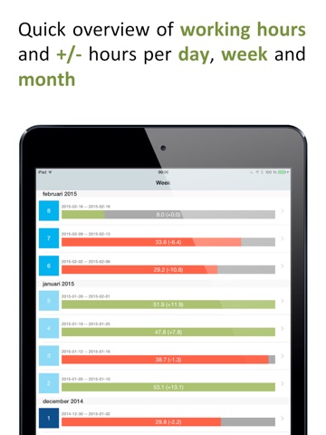 - Quick overview of working hours and +/- hours per day, week and month