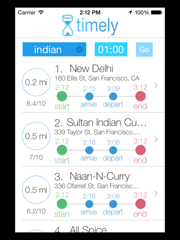 Just enter what you’re looking for (e.g. Thai, pastries, fast, etc.) as well how much time you can afford and Timely will return a list of places that you can go to, eat at, and come back from all within the entered time frame.
