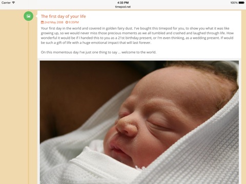 Each day is made up of a series of moments. These are the activities of all of us. Some are pointless. Some are great. These moments are who we are. It is our journey. Timepod can help you capture these moments and convey the cherished details into the future. This would be to show our children what we were like, what it was really like as they were growing up, maintaining a valid and real time crucible of knowledge for our childrens children, ensuring our lives and our decisions and our sacrifices are understood as part of the "rich tapestry of life", retained by the future as something valuable, not lost, not meaningless, not quickly fading into memory - something of worth and value for future generations to cherish.