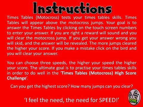 A fun yet challenging Times Tables game developed to suit a wide age range. Choose to take your time or go for turbo speed to gain bonus points. Times Tables (Motocross) has been developed using appealing graphics, catchy sounds and is optimised for all IOS devices.