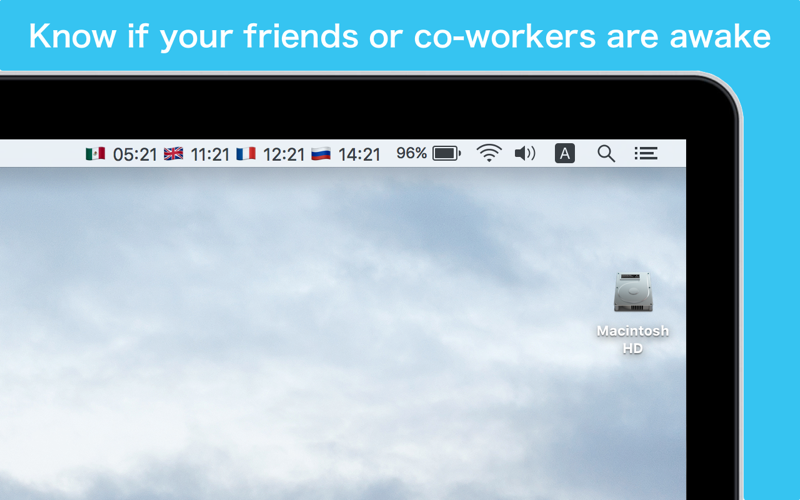 See at a glance the time in different timezones in your menu bar. No need to expand menus or open windows.