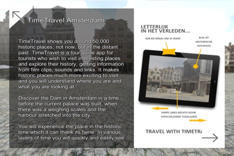 TimeTravel Amsterdam is the starting point to travel back in time with your mobile phone or tablet. Walk around the Amsterdam Dam and see how it looked like back in 1605. You do not simply watch pictures, you can explore the Amsterdam Dam in virtual reality!