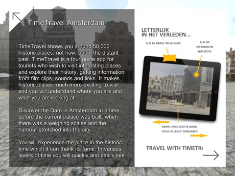 With your ideas, TimeTravel is not going to stop with the Amsterdam Dam. Other cities will follow. Be a part of a new travel adventure! Send us your ideas and comments that we can develop the best TimeTravel experience. Follow and like us on Facebook www.facebook.com/streetviewofthepast/timeline or keep up to date on our Website www.timetravelamsterdam.com/