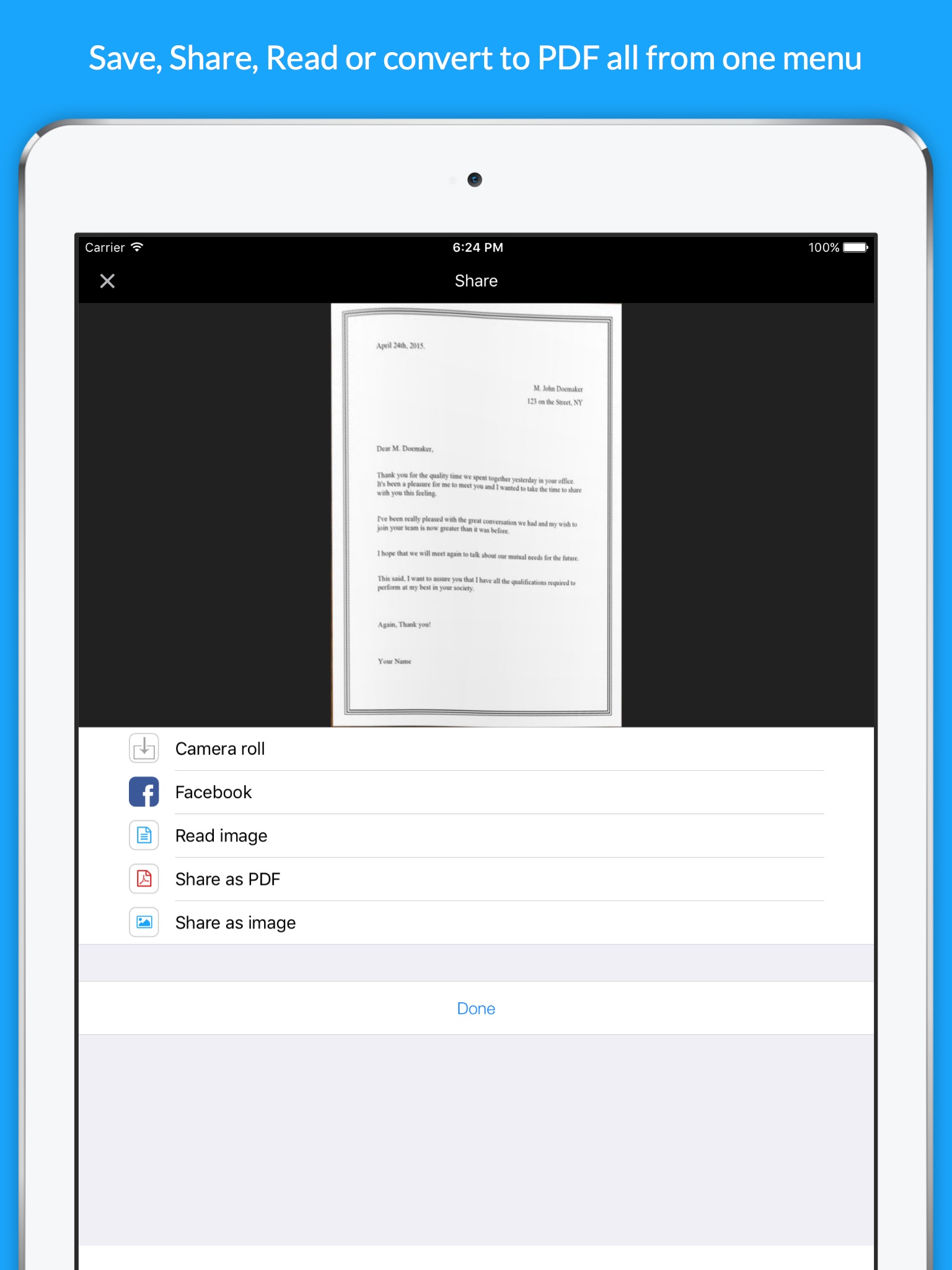 - Publish to Facebook, Share as PDF or Image, Save to Camera Roll or Email