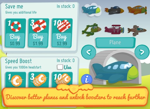 Jump into beautiful world of Tiny Planes. Join them in their endless journey through a world full of dangerous hills. Fly as fast as you can and try not to run out of gas. Meet Tiny One, Rocky, Jumby, Glidey, Eco Hippy and The Ace. Their all different, but share the same dream – to fly as far as possible. You can make their dream come true. Use Boosters to slide event further.