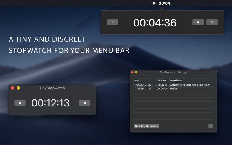 Take control of your productivity with TinyStopwatch, a powerful yet minimalist menu bar app designed for time tracking or basic stopwatches and timers. Whether youre tracking work hours, preparing your next 5-minute-presentation or analyzing your productivity patterns, TinyStopwatch helps you stay organized and efficient.