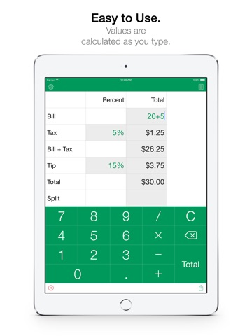 A beautifully designed tip calculator with an integrated in-line calculator to easily calculate tips, split the bill and save or share the results. Tap "Share" to Send or Save a tip. Tap "Total" to view a simple Summary View.