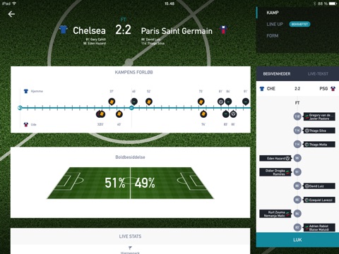 Derudover får du livescore fra alle vigtige fodbold ligaer. Du kan sætte overvågning på alle fodboldkampe eller dine favoritklubber, hvorefter du modtager automatisk besked ved kamp start, mål, røde kort m.m.