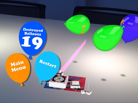 > Start the app, choose SURVIVAL or CASUAL and target the marker image with your camera (app needs permission to use the cam). Battle against the nasty balloons before they drop stuff on you and destroy you.