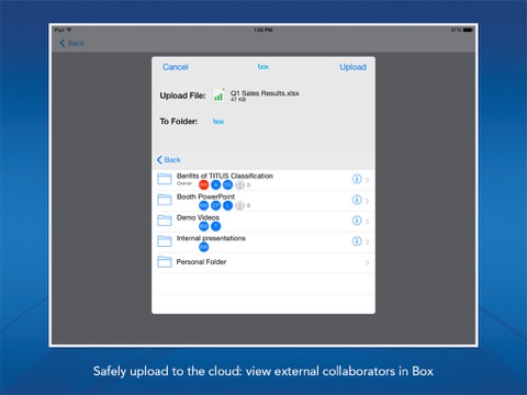 - Provides a more secure solution for browsing and uploading files to Box cloud storage