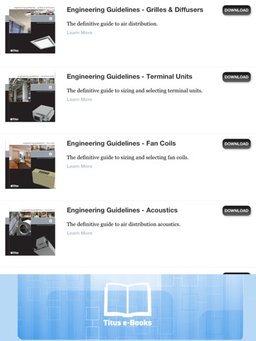 The Titus eBooks app provides enhanced digital versions of Titus literature. The app includes eBook versions of the Engineering Guidelines and other literature with bonus videos and images to help explain the concepts.